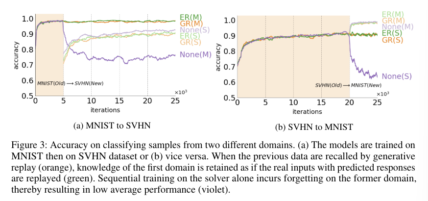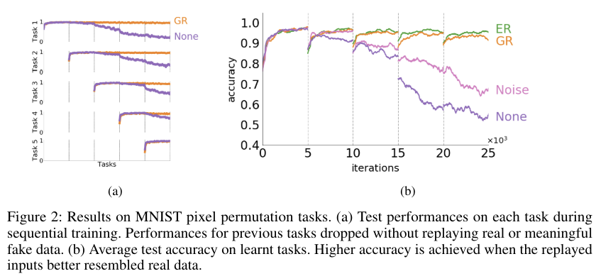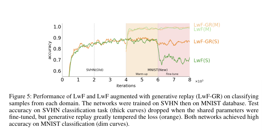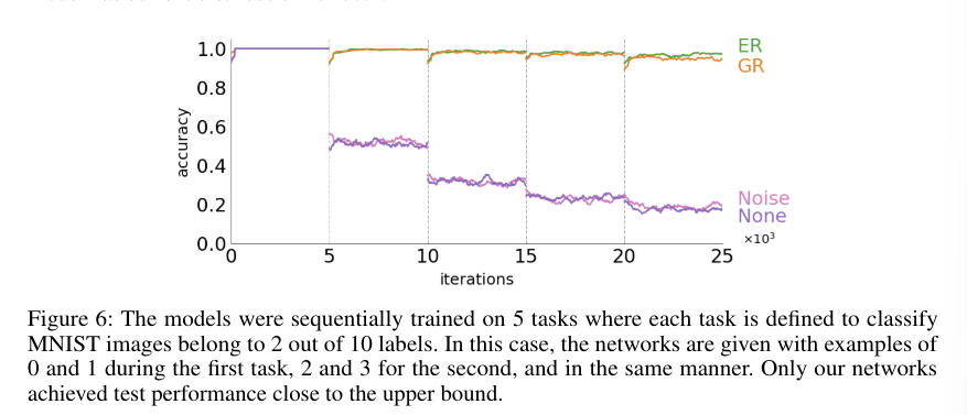 본 논문의 생성적 재생 프레임워크는 학습된 과거 입력 분포에서 생성된 가짜 입력을 사용하여 이전의 의사 리허설 기술과 다름. 생성적 재생은 생성기가 입력 분포를 복구하는 한, 네트워크가 생성된 과거 데이터와 실제 현재 데이터를 함께 최적화하기 때문에 실제 데이터를 누적하여 공동 학습하는 것과 동등한 성능을 보임.