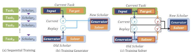 generator는 replayed 된 input data를 생성하고, solver는 real data + generated input 두종류의 데이터를 사용하여 모델을 학습, 이런 generator와 solver를 합친 것을 scholar 모델이라 부른다고 보면 됨