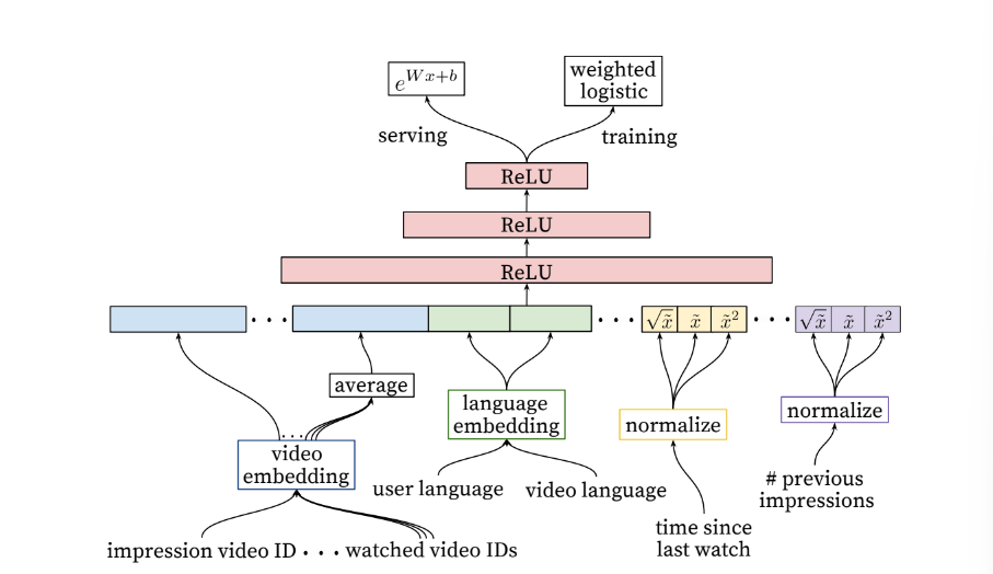 the list of vieo를 logistic regression을 사용하여 점수를 매긴 후, 이에 기반하여 sort를 진행하고 사용자에게 return. final ranking objective는 constantly being tuned based on live A/B testing result(generally a simple function of expected watch time per impression)