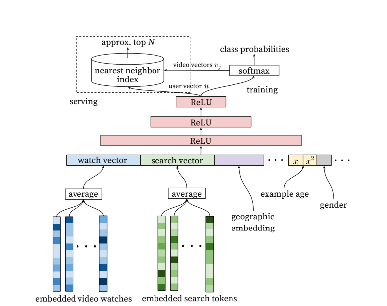 wt=video, V=video set(corpus), U=user, C=context, u=embedding of user, vj=embeddings of each video, N=# of videos