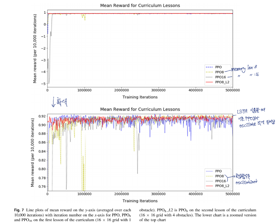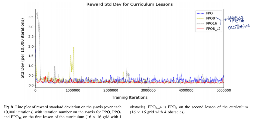 PPO8은 3M train 후 가장 작은 oscillation이 일어남