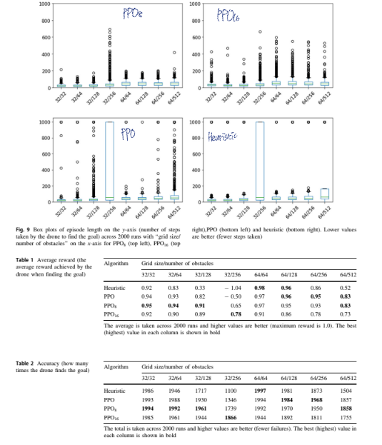 더하여 모델을 훈련했을 때 사용한 것과 다른 grid size와 해당 grid 내에서 다른 수의 obstacles로 평가함. 각 학습된 모델은 8가지 다른 구성으로 테스트 됨