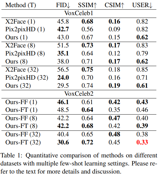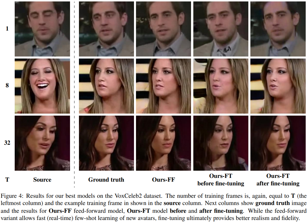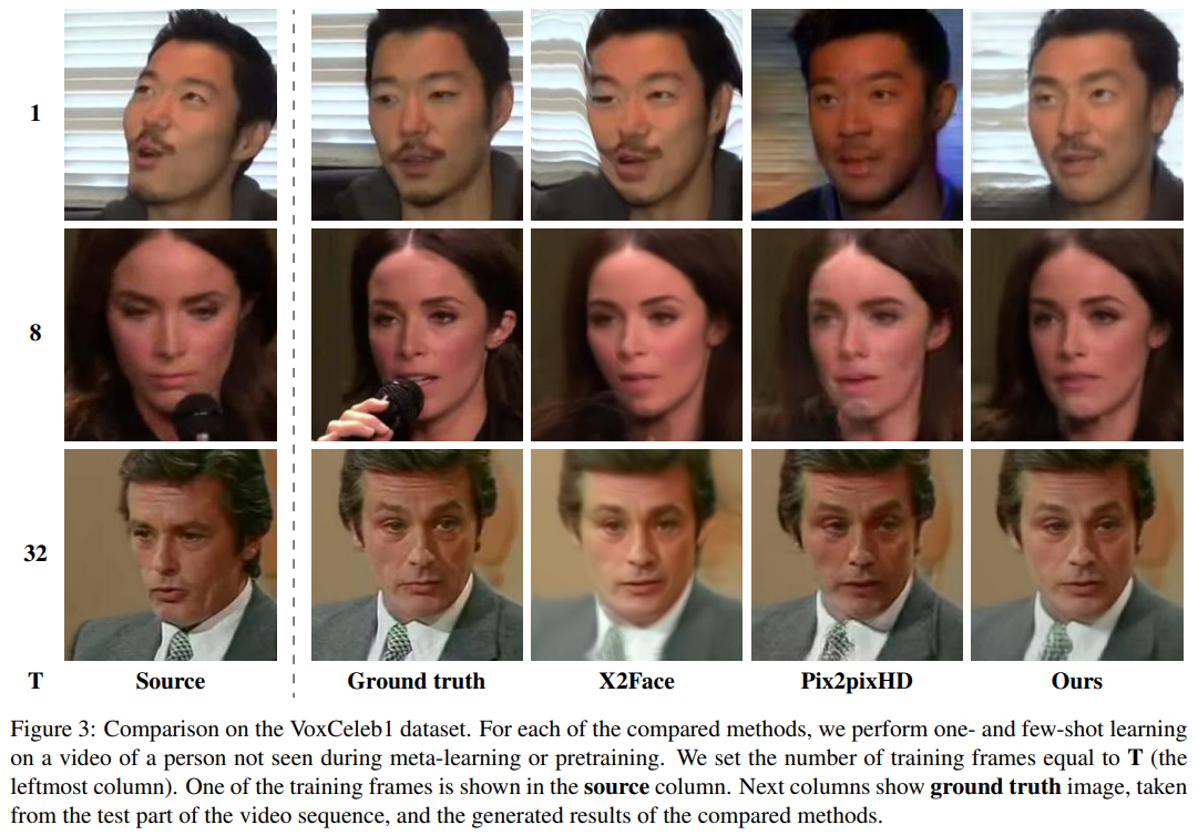 본 논문에서는 소수의 사진(few-shot learning)과 제한된 훈련 시간으로 talking head model을 생성하는 시스템을 제안함.
