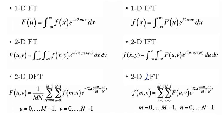 f ( x , y ) = ∫ − ∞ ∞ ∫ − ∞ ∞ F ( u , v ) e i 2 π ( x u + y v ) d u d v f(x,y) = \int_{-\infty}^{\infty}\int_{-\infty}^{\infty}F(u,v)e^{i2\pi(xu+yv)}dudv f ( x , y ) = ∫ − ∞ ∞ ∫ − ∞ ∞ F ( u , v ) e i 2 π ( x u + y v ) d u d v