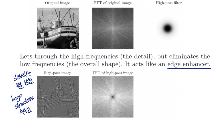 저주파를 제거하면 large strucres가 사라지고 edge와 같은 부분만 남게됨