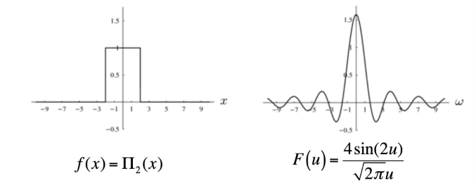 f ( x ) = Π b ( x ) = { 1 for |x| ≤ b 0 otherwise F ( u ) = π 2 ( δ ( u + w 0 ) + δ ( u − w 0 ) ) f(x)=\Pi_b(x) = \begin{cases} 1 & \text{for |x|}\leq b \\ 0 & \text{otherwise} \end{cases} \quad\quad F(u) = \sqrt{\frac{\pi}{2}}(\delta(u+w_0)+\delta(u-w_0)) f ( x ) = Π b ( x ) = { 1 0 for |x| ≤ b otherwise F ( u ) = 2 π ( δ ( u + w 0 ) + δ ( u − w 0 ) )