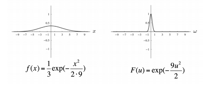 f ( x ) = 1 σ exp ( − x 2 2 σ 2 ) F ( u ) = exp ( − σ 2 u 2 2 ) f(x) = \frac{1}{\sigma}\exp(-\frac{x^2}{2\sigma^2}) \quad\quad F(u)=\exp(-\frac{\sigma^2u^2}{2}) f ( x ) = σ 1 exp ( − 2 σ 2 x 2 ) F ( u ) = exp ( − 2 σ 2 u 2 )