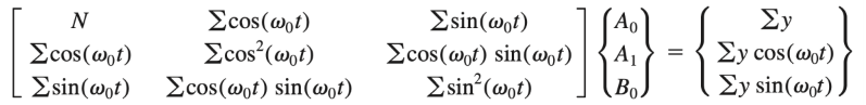 S S E = ∑ N i = 1 { y i − [ A 0 + A 1 cos ( w 0 t ) + B 1 sin ( w 0 t ) ] } 2 SS_E = \underset{i=1}{\overset{N}{\sum}}\{y_i - [A_0 + A_1\cos(w_0t) + B_1\sin(w_0t)]\}^2 S S E = i = 1 ∑ N { y i − [ A 0 + A 1 cos ( w 0 t ) + B 1 sin ( w 0 t ) ] } 2