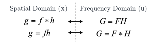 Convolution in spatial domain ⟷ Multiplication in frequency domain \text{Convolution in spatial domain} \longleftrightarrow \text{Multiplication in frequency domain} Convolution in spatial domain ⟷ Multiplication in frequency domain