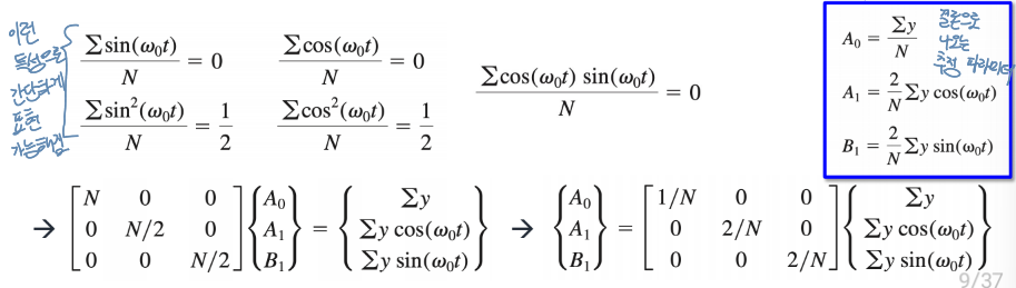 B 1 = 2 N ∑ y sin ( w 0 t ) B_1 = \frac{2}{N}\sum y\sin(w_0t) B 1 = N 2 ∑ y sin ( w 0 t )