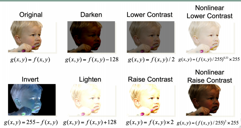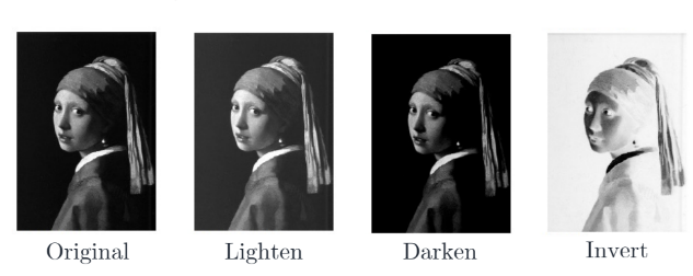 g(j,i)=⎩⎪⎪⎨⎪⎪⎧min(f(j,i)+α,L−1)max(f(j,i)−α,0)(L−1)−f(j,i)LightenDarkenInvert