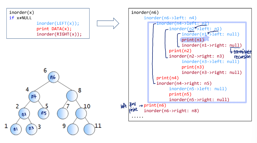 inorder(LEFT(x)); //inorder left recall 후 print own data