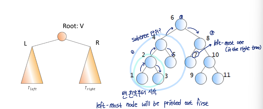 맨왼쪽의 child까지 왼쪽으로 진행하며 traversal하는 방식