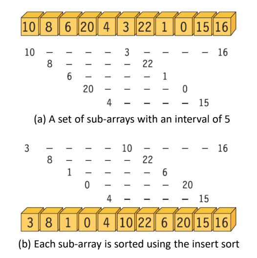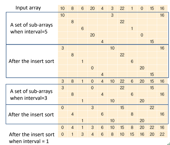 | Shell sort | O(n) | O(n^1.5) | O(n^1.5) | No |