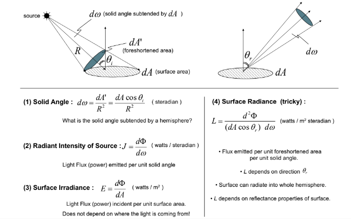 L=(dAcosθr)dwd2Φr=foreshorted area x solid anglepower (watts/m2 steradian)