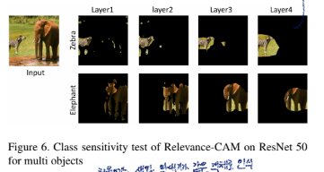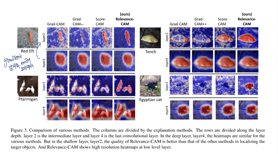 Relevance-CAM의 heatmap을 통해 얕은 레이어에서도 클래스의 특정 정보를 얻어낼 수 있다는 것 또한 알 수 있음