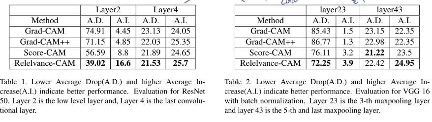layer4에서는 다들 성능이 비슷하나 layer2에서는 Relevance-CAM의 성능이 눈에 띄게 좋음을 알 수 있음