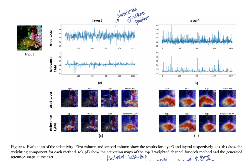 Grad-CAM에서 낮은 레이어의 경우 shattered gradient problem이 발생함을 확인할 수 있음, 그러나 Relevance-CAM은 shattered gradient problem에 robustness함