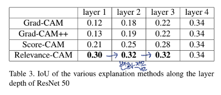 IoU metric으로도 성능 측정을 해본 결과, Relevance-CAM은 layer가 shallower해져도 성능에 차이가 적었음