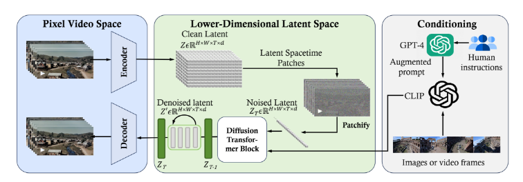 text-to-video 생성은 diffusion transformer model을 사용하여 frame filled with visual noise에서 noise를 반복적으로 제거 + 텍스트에 주어진 것에 따른 디테일들 추가를 통해 진행