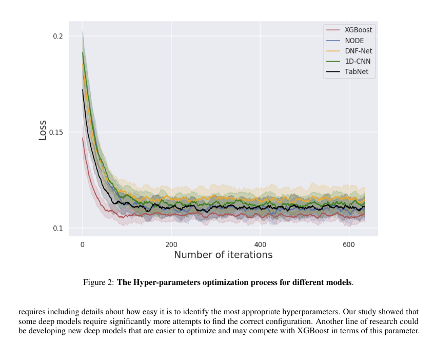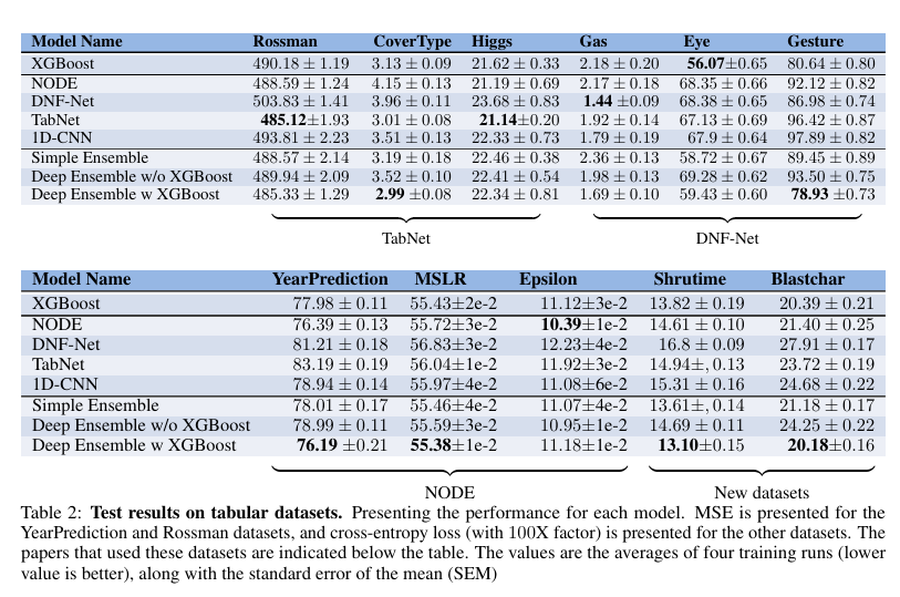 본 논문에서는 이러한 deep model과 XGBoost의 ensemble을 제안함. 이는 individual model 및 non-deep classical ensemble보다 더 나은 성능을 보임. 더하여 실제 응용에서 중요한 performancem computational inference cost, hyperparameter optimization time을 연구함. 결과로 보고된 deep model의 성능은 그대로 받아들이기 힘들다는 결론을 얻음