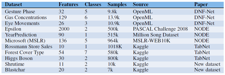 최근 tabular data에 대한 DN을 개발하려는 시도가 여러 번 있었는데, 그 중 일부는 GBDT보다 우수한 성능은 보인다고 주장되었다. 그러나 서로 다른 데이터셋을 사용했기 때문에 tabular data model을 정확하게 비교하는 것은 어려움. 그리고 일부 연구들은 이러한 모델들을 동일하게 최적화하지 않음.