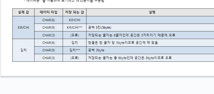--> ex) CHAR(10) 컬럼에 'ABC' 3BYTE 문자열만 저장해도 10BYTE 저장공간을 모두 사용.