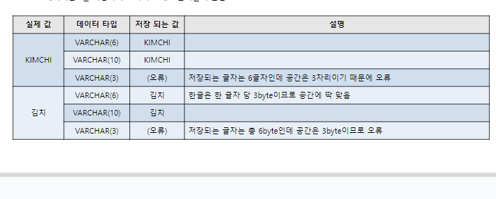 --> ex) VARCHAR2(10) 컬럼에 'ABC' 3BYTE 문자열만 저장하면 나머지 7BYTE 반환함