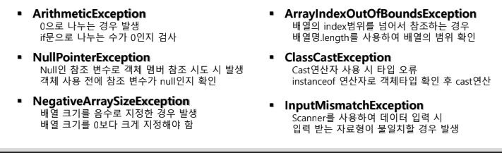 Unchecked Exception으로 주로 프로그래머의 부주의로 인한 오류인 경우가 많기 때문에