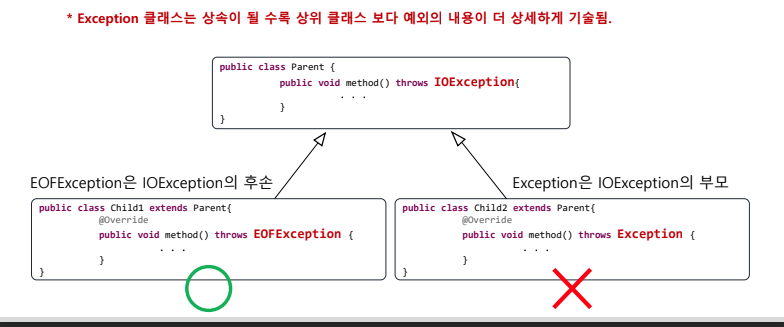 오버라디이 시 throws하는 Exception의 개수와 상관없이 처리 범위가 같거나 후손 이여야 함