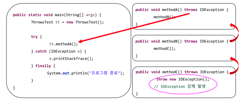 메소드 선언 시 throws Exception명을 추가하여 호출한 상위 메소드에게 처리 위임