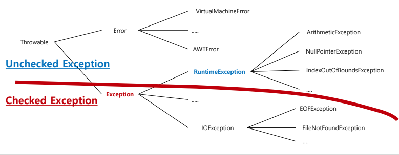 반드시 예외 처리해야 하는 Checked Exception과 해주지 않아도 되는 Unchecked Exception 으로나뉨