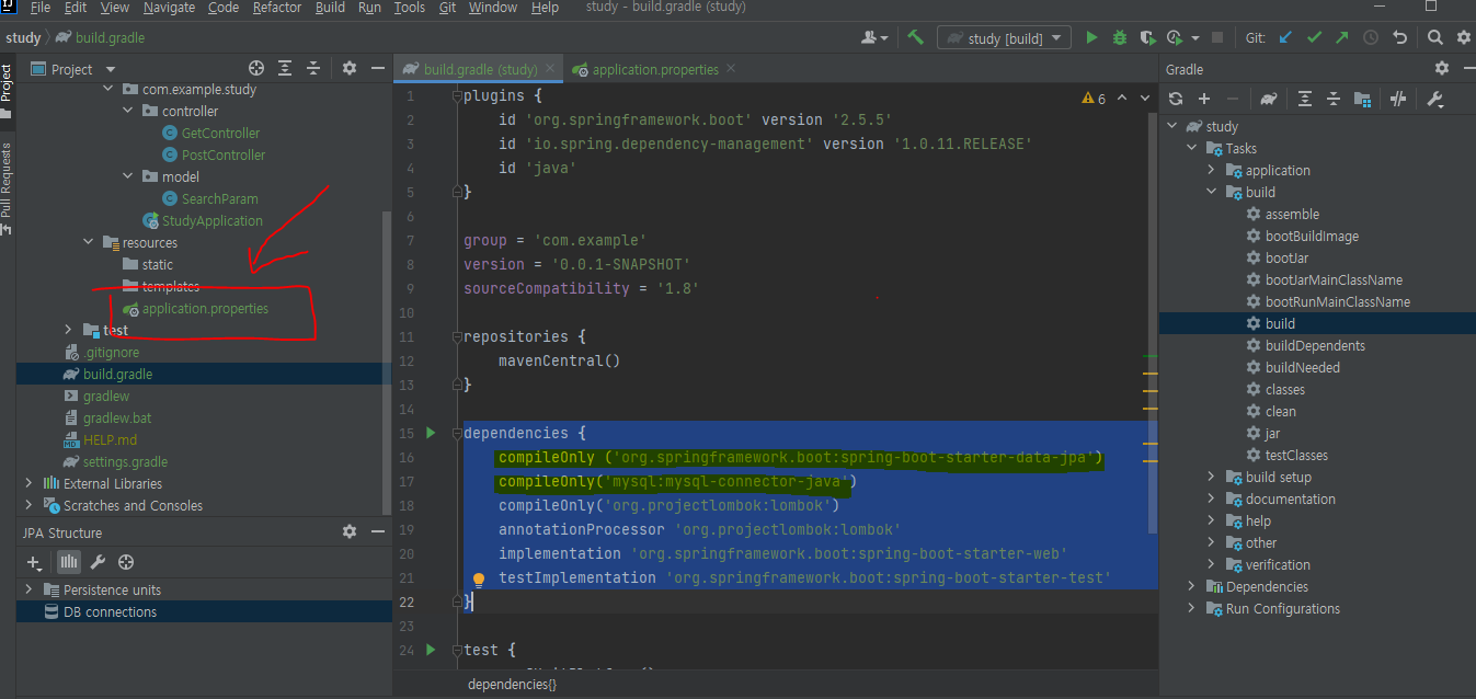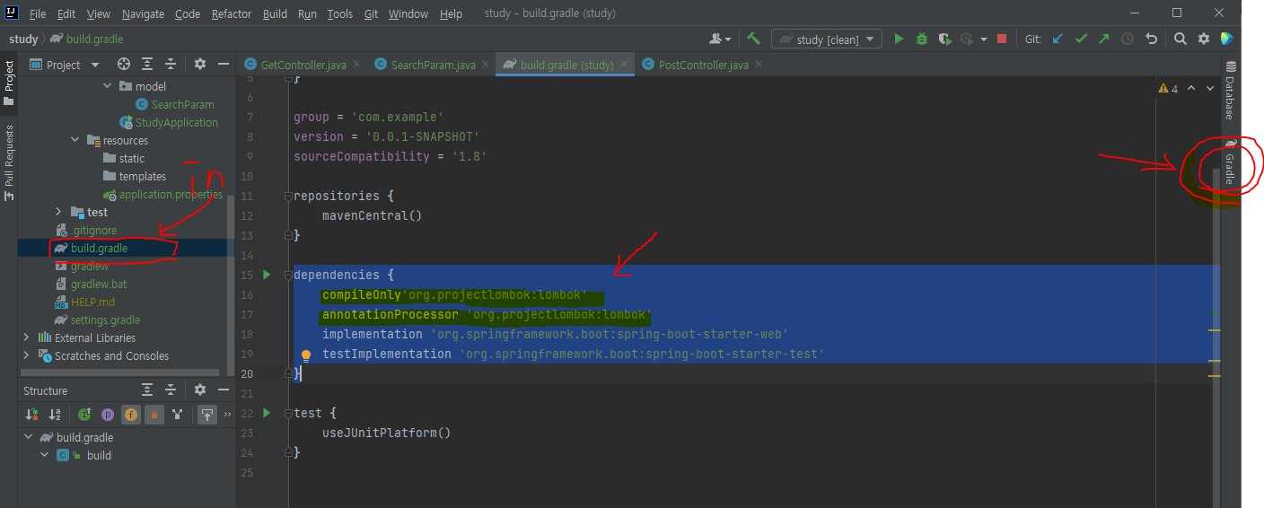 로 들어가서dependencies { //compileOnly'org.projectlombok:lombok' //annotationProcessor 'org.projectlombok:lombok' implementation 'org.springframework.boot:spring-boot-starter-web' testImplementation 'org.springframework.boot:spring-boot-starter-test' }
