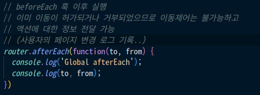 afterEach 메소드는 컴포넌트단의 내비게이션 가드까지 실행되고 나서 실행된다.