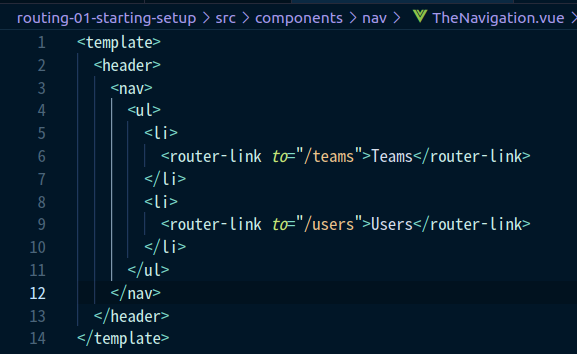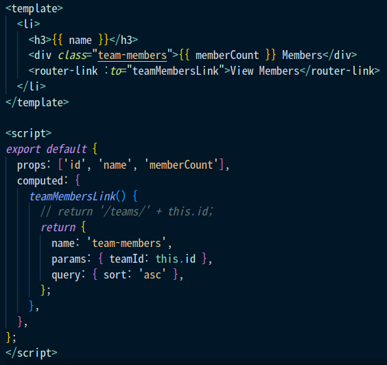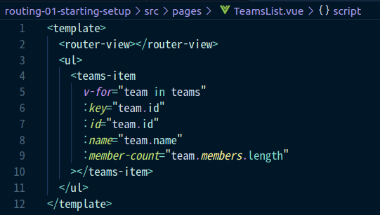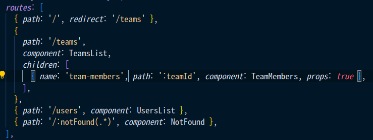 따라서 중첩 라우트로 작성된 ':teamId' 경로의 라우트는 해당 중첩 라우트가 작성된 부모 요소인 TeamsList 컴포넌트에 router-view 로 렌더링 위치를 지정해주어야 한다.