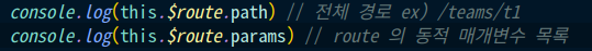 route 의 동적 매개변수는 ' : ' 콜론 기호를 사용하며 위 사진에서는 teamId 라는 이름의 동적 변수를 이용하고 있다.