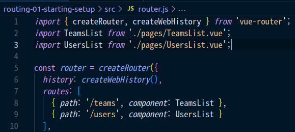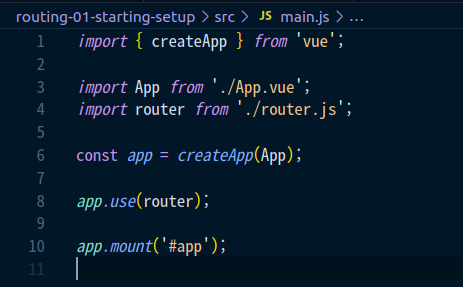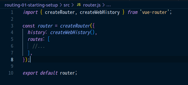 이때 router 인스턴스 객체를 생성하기 위해 vue-router 라이브러리로부터 createRouter 메소드를 import 해온다.