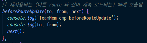 이때 계속 재사용되는 라우트에 beforeRouteUpdate() 메소드로 해당 라우트가 다시 사용되기 전 동작을 제어할 수 있다.