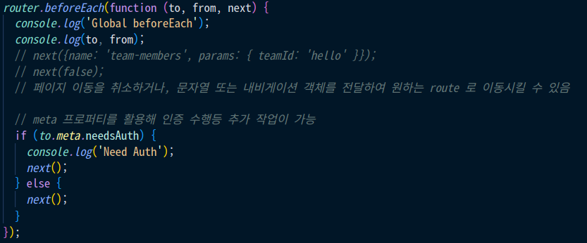 beforeEach 메소드는 router 내에서 전역적으로 실행되는데,