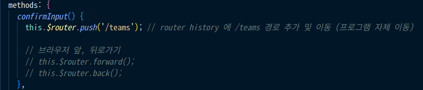이때 push 메소드를 이용해 해당하는 문자열 경로의 컴포넌트로 이동하게끔 지정할 수 있다.