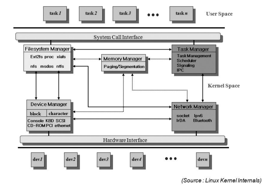 - 크게 태스크 관리자, 메모리 관리자, 파일시스템, 네트워크 관리자, 디바이스 드라이버 관리자로 나뉨