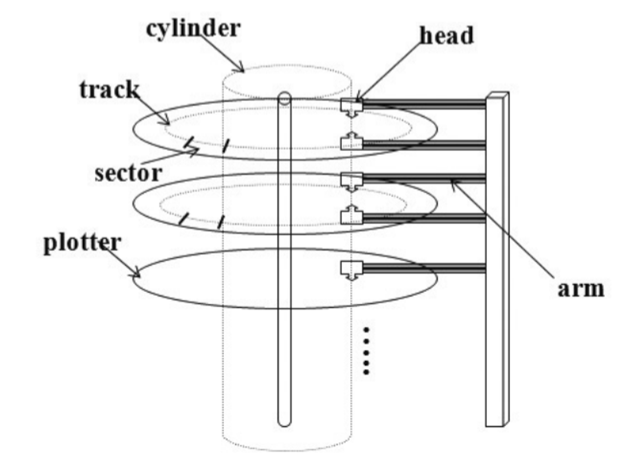 - 원 모양의 트랙(track)들이 존재 ** 실린더(cylinder) : 모든 원판에서 같은 위치를 갖는 트랙들의 집합