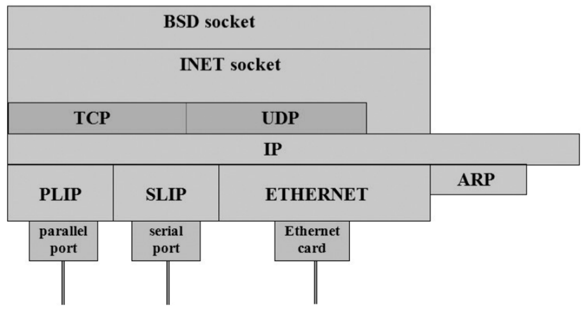 - 제어 흐름이 다양한 곳으로 분기할 수 있는 상황을 효과적으로 지원하기 위해 층 사이에서 제어가 전달될 때 자료구조를 이용한 간접 호출 방법으로 통신 프로토콜 구현 ⇒ 하위 층에서 제공하는 함수를 상위 층에서 이용할 때 상위 층에서 직접 이 함수를 호출하는 것이 아닌 하위 층이 자신이 제공하는 함수의 시작 주소를 특정 자료구조에 등록하고 상위 층에서는 단지 자료 구조에 등록된 함수를 호출하는 방식으로 함수를 간접 호출