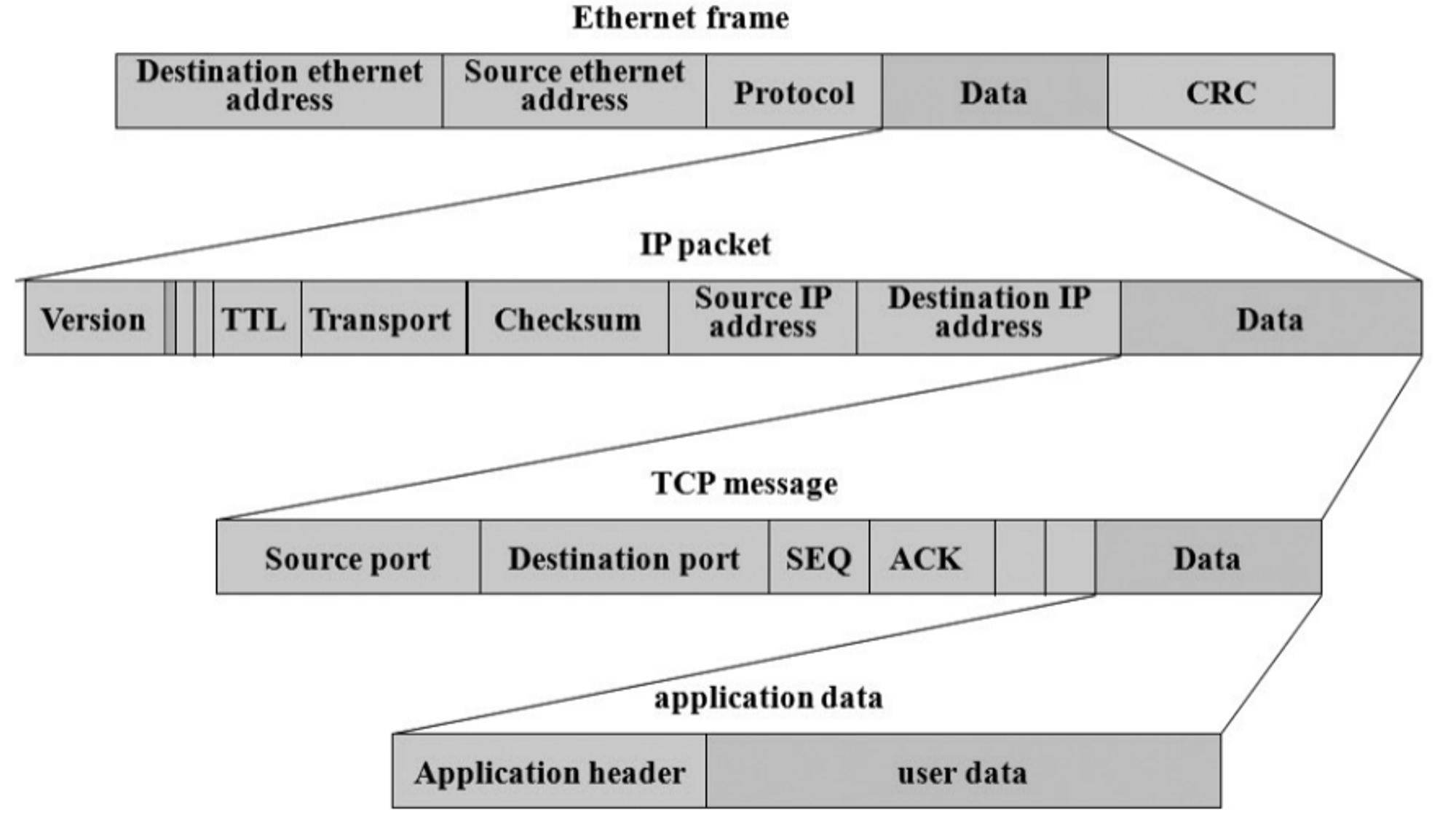 사용자가 응용 프로그램에게 전송할 데이터 보냄 → 응용은 자신의 제어에 필요한 데이터를 헤더에 추가 → 응용 데이터가 TCP 층으로 전달 → TCP 층에서 자신의 헤더를 이 데이터에 추가하여 메시지(소스 포트 번호, 목적지 포트 번호, 일련 번호, 응답 번호 등) 생성 → 메시지 IP층으로 전달 → IP층에서 자신의 헤더를 이 메시지에 추가하여 패킷 생성 (필요할 경우 단편화 수행) → 패킷 이더넷 층으로 전달 → 이더넷 층에서는 자신의 헤더를 이 메시지에 추가하여 프레임 생성