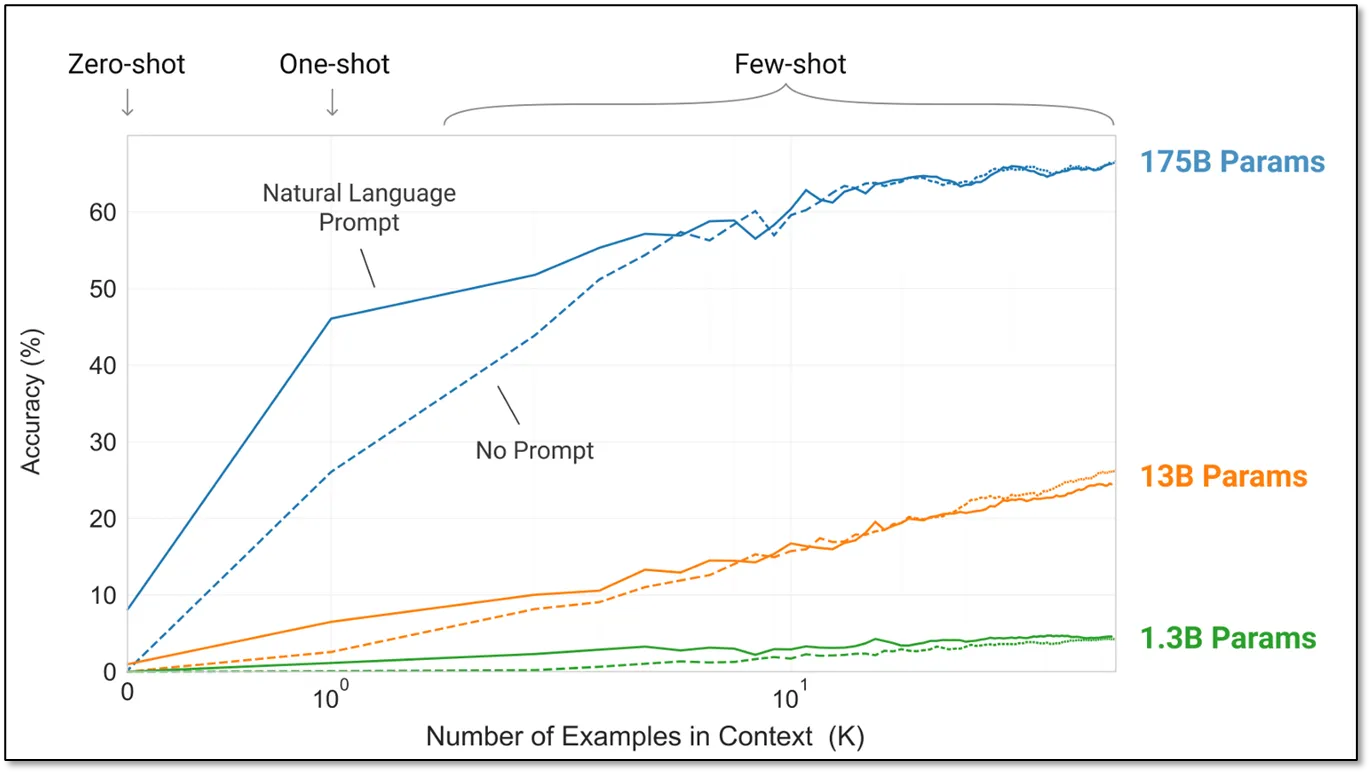 위 그래프를 보자. 모델의 크기가 작을 때는 아무리 많은 예제를 제공하더라도 성능의 변화가 없지만, 모델이 커지면 커질수록 예제의 개수에 따라 추론 성능이 올라가는 것을 볼 수 있다.