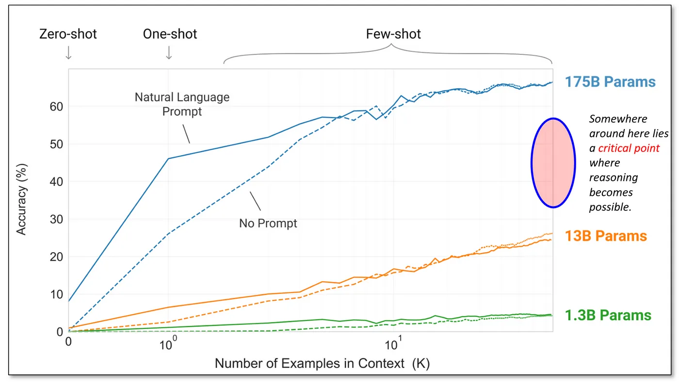 아직 이론적으로 완벽히 밝혀진 바는 없지만, 다음 그림처럼 아마도 13B ~ 175B 사이 어딘가에서 추론 능력을 발아시킬 수 있는 모델의 Critical Point가 존재한다고 추측하는 의견이 많다.
