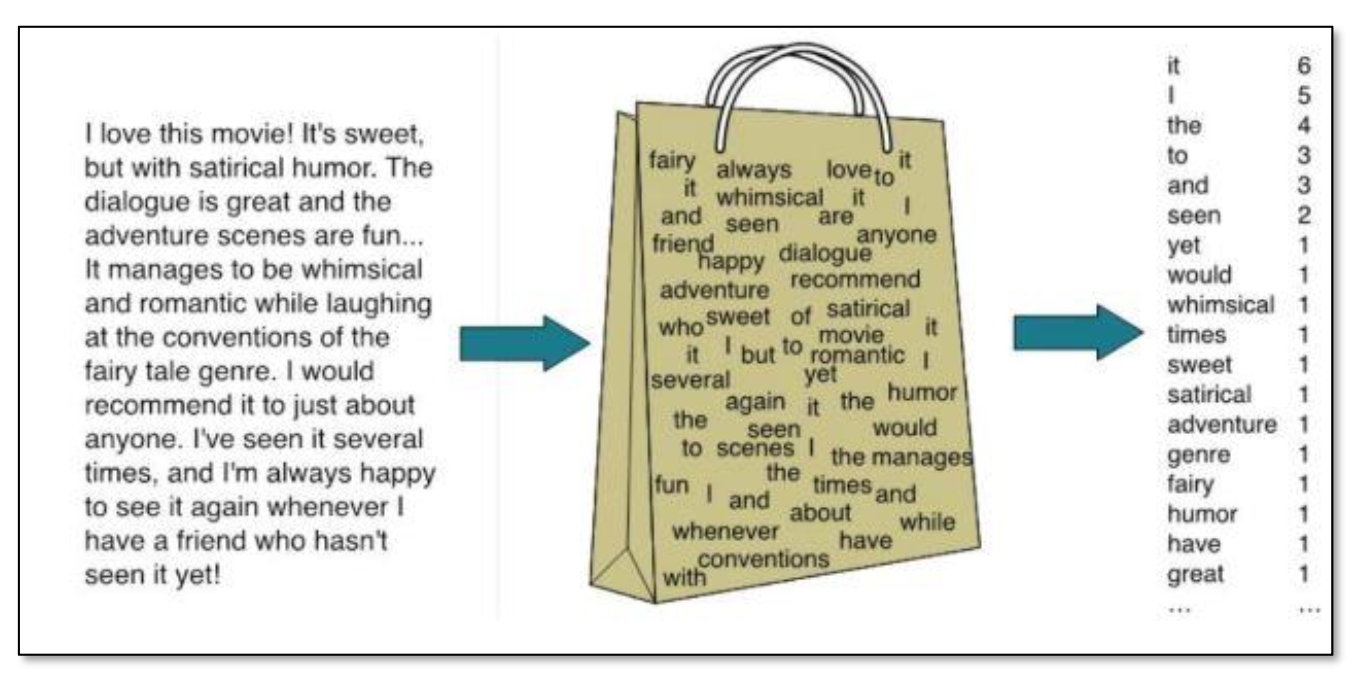 이는 문서나 문장을 '단어의 가방(단어들의 집합)'으로 취급하여, 문서 내 단어의 출현 빈도를 기반으로 벡터를 생성한다.
