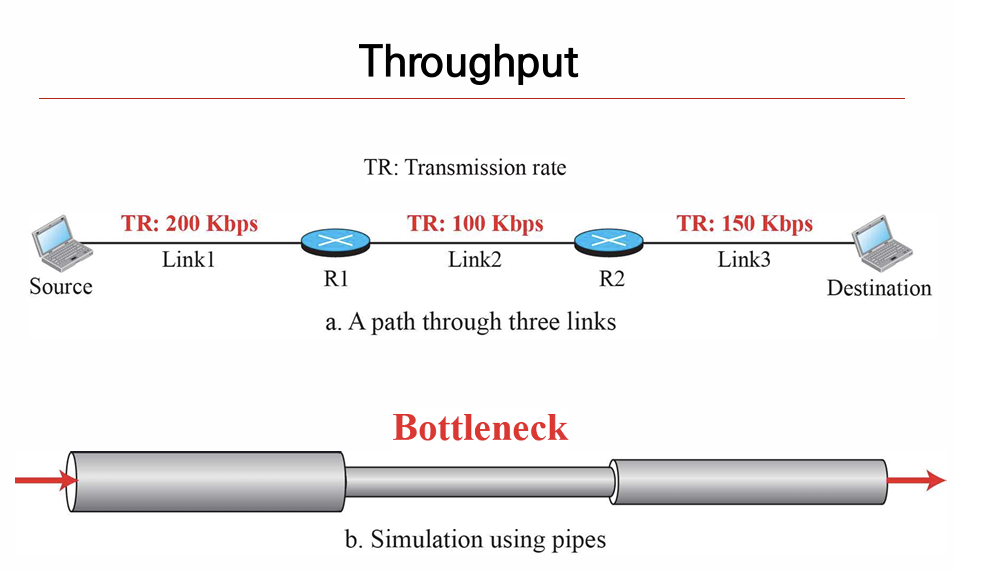 위와 같은 상황에서 링크 전체의 전송 속도는 최소 처리량인 로 제한된다.