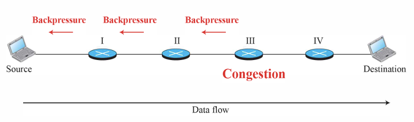 혼잡이 발생한 라우터는 데이터 흐름 순서상 이전 라우터에게 신호를 보내 데이터 전송을 늦추거나 멈추도록 요청한다.