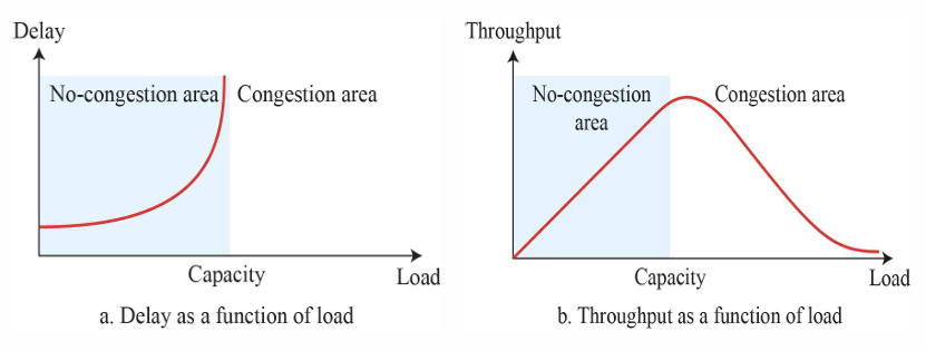 No-congestion area (비혼잡 구간) : 부하가 적은 구간에선 지연 그래프의 증가율이 낮지만, 부하가 네트워크 용량에 근접할수록 지연이 무한대로 발산한다.